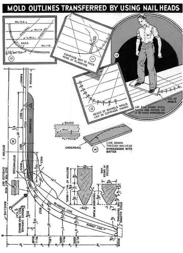The simplest method to use in transferring the outlines directly to your mold material is to use nails in the manner shown in Figs. 12 and 13. To do this, arcs are scribed as in Fig. 11, using a compass set to equal the thickness of the planking which is 11/16 in. Now, following Fig. 12, shingle nails are set with their heads in the arcs, over which your mold stock is placed as shown in Fig. 13. Then, being careful not to disturb the position of the nails, apply your weight to make slight impressions on the underside of the work.