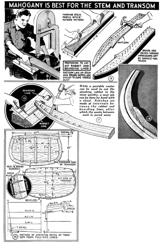 The outline of the stem is transferred in the manner described for the molds, except that instead of being impressed directly upon the mahogany stem blank, plywood is used from which a pattern is cut and later used to trace the outline as in Fig. 16. The knee or anchor lock is outlined in the same manner. To lay out the rabbet and bearding lines on the stem, proceed with the nail-head method, working from the full-size outlines. Then a brad is driven through each indentation, the pattern is laid on the work and the nails are tapped through to make a prick mark on the stem. Both sides of the stem can be marked with the same plywood pattern by simply reversing the brads in the holes. See Fig. 16. Figs. 17, 18 and 19 detail the cutting of the planking rabbet. This is chiseled by hand and checked from time to time for the correct angle with a fid which is simply a small block the same thickness of the planking, Fig. 19. This angle at the sheer and waterlines can be taken from the plan lines on the floor. Sections of the stem are given in Fig. 15. Cuts are made at regular intervals along the rabbet and bearding lines and then the waste is removed between these notches to form a continuous rabbet as shown in Fig. 18. The stem is left extra long to allow for trimming to exact length at the sheer. Fig. 15 shows the relative positions of the stem, deadwood and keel with reference to station No. 1 and the waterlines. All three pieces are checked with the full-size floor plans as in Fig. 1, and are bolted together with four 8-in. brass bolts, the heads of which are ground flat to fit tightly in slots made in the cutwater or front edge of the stem. Also, two stopwaters are inserted where indicated. These are simply 3/8-in. white-pine dowels driven tightly in undersize holes. When these become wet, they swell to make a watertight joint.