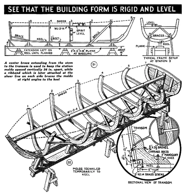 Constructing a building form that is square, true and rigid is as important as the work on the boat itself. Figs. 21 and 22 show how the form is assembled. This must be set up absolutely level. If set on the ground, be sure that it is placed on firm soil. Note the 2 by 4-in. braces under each station and the diagonal braces from No. 1 to No. 2 and from No. 5 to transom. The keel is bolted to the plank which later serves as a baseline. Use a spirit level and square to see that each mold is at right angles to the keel and absolutely vertical. The end view in Fig. 21 shows additional braces supporting each mold from the floor.