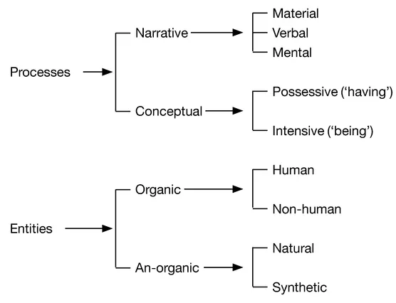 The linguistic model our thinking about new media takes inspiration from is systemic linguistics (e.g. Halliday 1994; Eggins 1994). Systemic linguistics describes language as a set of choices, extending from the most general to the most specific. These choices form the âmeaning potentialâ of (a) language. They are expressed as abstract features that specify among other things the processes and entities that make up the structure of the basic unit of language, which is the clause, or simple sentence. These entities and processes are then realized, or translated, by verbs and nouns and other such familiar grammatical categories. In the case of processes, for instance, the most general choice is that between ânarrative processesâ, which represent actions and events (for instance âwalkingâ, âspeakingâ and âdesiringâ), and âconceptual processesâ, which represent more or less permanent and unchanging âstatesâ (for instance âhavingâ and âbeingâ). As can be seen in Figure 1.1, each leads to more specific choices. Narrative processes, for instance, include âmaterial processesâ (such as âwalkingâ or âbuildingâ), âverbal processesâ (such as âsayingâ or âaskingâ) and âmental processesâ (such as âthinkingâ or âfearingâ). âConceptual processesâ include âhavingâ and âbeingâ. Needless to say, such choices lead to further, even more specific choices, until we arrive at very specific actions such as âwalkingâ, âprotestingâ, âsmellingâ, and so on. The same applies to âentitiesâ, as also shown in Figure 1.1. Different kinds of processes combine with different kinds of entities. âMental processesâ, for instance, combine with two kinds of entity, a human one, the entity whose mental process it is (it may also be any other entity to which we ascribe similar mental processes as we do to humans) and the object of the mental process (what it is that is being thought or feared or whatever). For instance in the sentence âHe feared the worstâ, âheâ is what systemic linguists call the âSenserâ (the human entity who does the âfearingâ), âfearedâ is the mental process, and âthe worstâ is the object of the fear, the âPhenomenonâ, as systemic linguists call it.