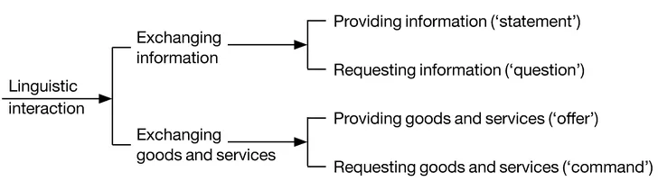 According to systemic linguists, language is always patterned to simultaneously communicate three broad types of meaning â ideational, interpersonal and textual. Linguistic messages such as sentences, and also larger stretches of text, always have an ideational, an interpersonal (we might also say, âinteractiveâ) and a textual meaning. Ideational meanings communicate information, for instance the fact that there was a person who âfeared the worstâ. But by varying the interpersonal patterning, different interactions can be created while keeping the information the same, for instance the choice between providing information (âHe fears the worstâ) and requesting information (âDid he fear the worst?â) (Figure 1.2). Textual meanings allow different parts of the information to be emphasized or foregrounded in different ways, and to create coherence and cohesion in longer texts. They do this both by cohesive devices that hold a text together â such as anaphoric pronouns that refer back to entities that were mentioned earlier â and by more or less rhythmically summarizing and expanding a textâs content.