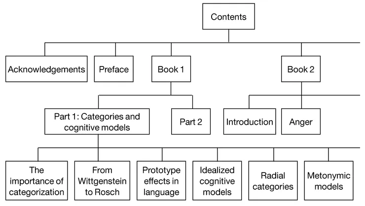 Take the example of George Lakoffâs book Women, Fire and Dangerous Things: What Categories Reveal about the Mind (1990). It has a table of contents with four levels. At the highest level is the whole table of contents. The second level is formed by âAcknowledgementsâ, âPrefaceâ, âBook 1â, âBook 2â, âAfterwordâ, âReferencesâ, âName Indexâ and âSubject Indexâ. At the third level, Book 1 is divided into âPart 1â and âPart 2â, and Book 2 into âIntroductionâ, âAngerâ, âOverâ and âThere-Constructions'. Part 1 and Part 2 are then divided into chapters. In the text itself, the chapters are divided into sections, which thus form another level of the hierarchy. The tree can be represented as in Figure 1.3.