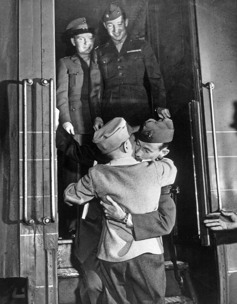 Reunion of Major James P. Devereux and his son in October 1945. Devereux led the stubborn resistance to the Japanese takeover of Wake Island in December 1941. While he was interned in a Japanese prison camp, his wife passed away. (Thomas D. McAvoy/Time & Life Pictures/Getty Images)