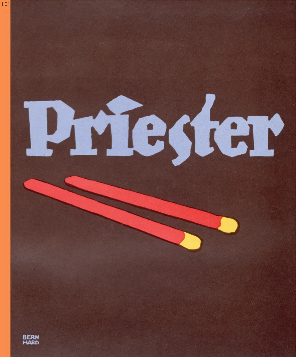 This Priester matches poster was considered a work of genius and made Lucien Bernhard famous. While a struggling young artist in Berlin, he won a poster contest with this radically concise design. His poster successfully reduced the style of commercial communication from complex lithographs (Art Nouveau posters) to one word and two matches. Bernhardâs bold colors make the visually simple message powerful. He repeated his formulaâflat background color, product name, and simple imageâfor over twenty years. His designs moved graphic communications forward and continue to inspire new designers to communicate with simplified form and bold colors.