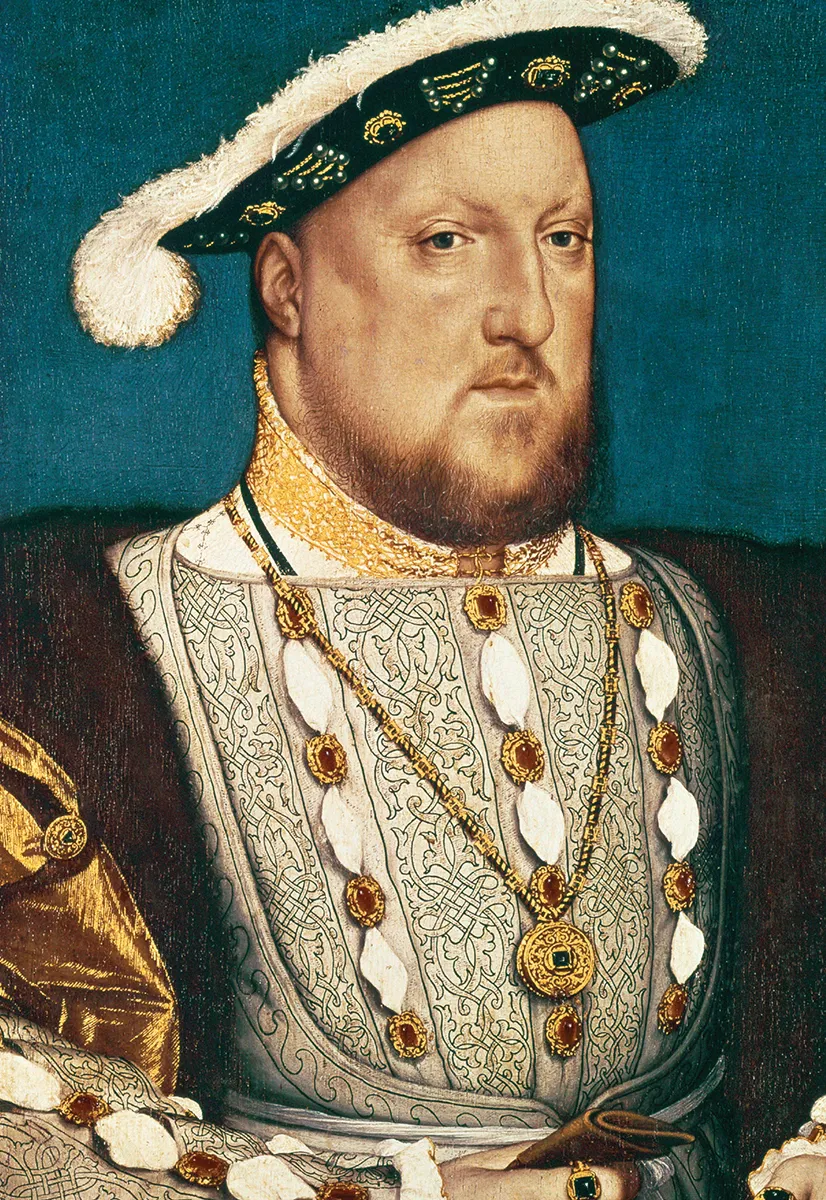 This portrait of King Henry VIII emphasizes the broad, layered silhouette and decorative slashes of the male dress of the northern Renaissance.