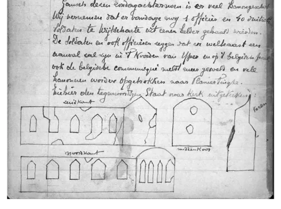 10 June, Sunday. Quite a lot of firing in the night. In the early morning the Germans send shrapnel shells over to behind Razelput and during high mass to Marcel Coene’s farm, probably aiming for the balloons. A fair number of people in the masses, in the high mass, however, rather fewer than usual. Between masses I go to the centre of the village. The guns have gone from De Hert and from the Onraet and Comyn farms. The guns behind Baes’s farm and at Oudewal, the Planckeel farm, Commeerestraat and Vijf Geboden are still there and are firing hard above my head. The 60-pounder from Dalle’s farm left yesterday too. Our village is sadly changed since my last visit. The following houses have now joined the list of those that have been bombarded: the houses of Henri Dumortier, Henri Vermeulen, Henri D’hellens, Theophiel De Baene, Jules Noyelle, Justin Thevelin, Désiré Delanotte, Theophiel Leeuwerck, Maria Lauwyck, Jules Deraeve, Henri Van Damme, Désiré Van Renterghem, and the widower Francis Goethals. (The whole of Van Renterghem’s house and a third of Goethals’s were wiped out by a single shell.) The houses in best condition are those of Edward Lauwyck, Angillis, Leon Batteu, Maurits Devos, Benoit Leleu, and Mr Nollet (the schoolmaster), as well as the school, and then those of Bruno Van Wonterghem and Arthur Dumortier. However, of all these houses only one of them, that of Edward Lauwyck, could be restored at a cost of less than 1,000 francs.