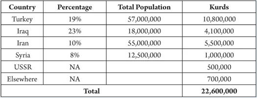 Pelletiere (1984) approximates the Kurdish population in Turkey, Iran, Iraq, Syria and the former Soviet Union to be between 7 and 7.5 million. A breakdown of this figure illustrates the following: 3 million in Turkey, approximately 2 million in Iran and 2 million in Iraq and a very small number of Kurds in Syria and the former Soviet Union. See the distribution of the Kurdish population: