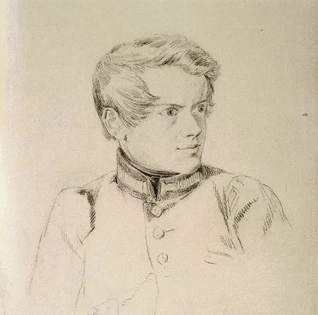 Sometime between 1813 and 1816, in the years immediately following the defeat of Napoleon, a boy named Karl Briullov made his first self-portrait [Figure 1.1]. In it, he looks intensely at something over his left shoulder; his eyes are wide and bright at the sight of it. His jacket is buttoned up and the cravat underneath it is carefully wound, the dark fabric neatly tucked beneath the rigid collar. His shoulders are slightly hunched, and the faintest outline of a hand appears tucked inside his jacket. Above all this, the artist carefully delineated his own facial features with light pencil strokes. He lit his own visage brightly, almost artificially, with only the faintest of shadows cast under the right eye and the bottom lip. The focus is clearly on the face, and despite the sharp three-quarter profile, the far eye is not lost, nor is it shadowed. Instead his averted gaze reads as purposeful and brightly confident. The firmness of the jaw, the aquiline tip of the nose, the sweep of the hairâall hint at the budding personality of a young man already wielding considerable artistic talent.