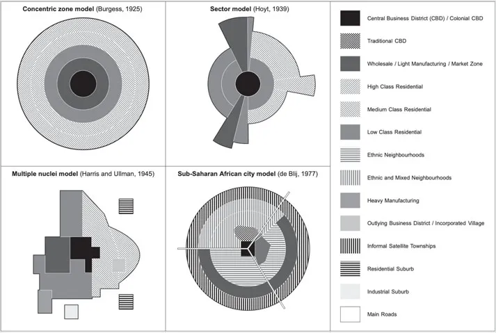 Various theoretical descriptive models have been developed in order to simplify the structure of the different urban spatial settings that organise the various urban functions in space. Models of urban structure were developed to better understand the underlying forces and rules. They were first developed by US-American researchers with reference to North American cities before other researchers picked up the idea and applied it to other cities, including African cities (Figure 1.1). An early descriptive model for contemporary African cities, which followed the ideas of these other models, was created by Harm de Blij during colonial times in 1962 (see Fouberg et al. 1977). South Africaâs urban apartheid model (e.g. Davies 1981) will not be discussed here since it is a unique model and not transferable to other (East) African cities. The same applies to the ancient pre-colonial African cities (see Anderson & Rathborne) which have not had a significant impact on the contemporary cities.