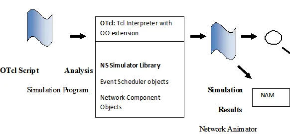 As shown in figure 1.1, Network simulation is an Object-oriented tool script interpreted with simulation event scheduler, with the libraries of network component object, and with the libraries of network setup (plumbing) module (it is the plumbing modules which is implemented as member functions of the base simulator object). To use NS, we have to do programming in OTcl script language.