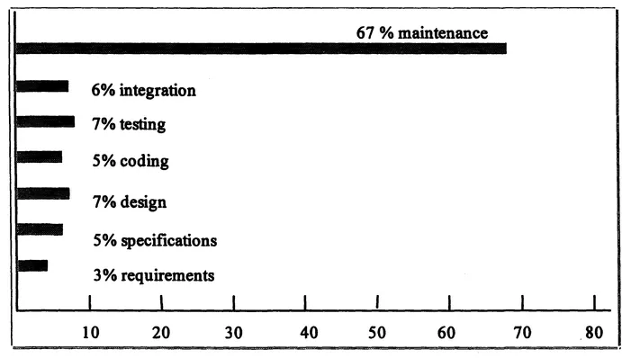 As we consider the usual costs for systems development, we must also keep in mind that development costs are only the "tip of the iceberg." Figure 1.2 displays an example ratio of a project's tasks and the percentage of total costs that can be attributed to each task. The percentage of costs for maintenance (67%) relative to other tasks is quite high. Most maintenance costs are a result of effort expended providing required, but missing functionality, making corrections, and dealing with compatibility issues. Each of these issues relates to requirements, and obviously, developers would like to find ways to reduce these costly expenditures. If these maintenance costs reflected extensions, newfeatures, and integration into other systems, the ratio might be more acceptable. The improved use of maintenance costs is one of the goals for new systems/software engineering processes.