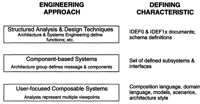 The transition from traditional approaches to complex systems approaches can be represented historically by some major milestones. Figure 1.3 depicts a transition from traditional code integration, through Structured Analysis and Design Techniques (SADT), into component-based design, and finally to an emphasis on users and their needs. As this historical progression indicates, today there is much more of an emphasis on user involvement and satisfaction in systems development.