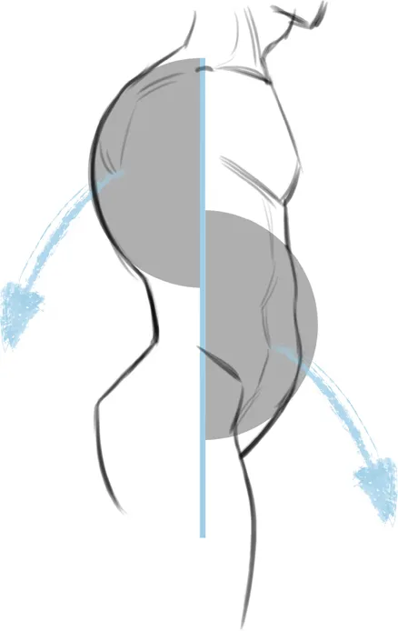Rhythm creates balance. The human figure is not only made of FORCE but also form, otherwise known as anatomy. The top-left image presents a balanced, vertical line since the sphere at the top is perfectly centered on the vertical axis. The center image shows how a form, the hemisphere, when on one side of the vertical blue line, wants to fall to the left side. The downward blue arrow shows how gravity would pull the hemisphere down in an arc toward the ground. The bottom-right image offsets the hemispheres, retaining balance yet creating rhythm!
