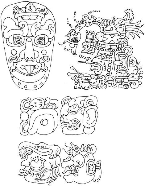 The deity GI is an anthropomorphic god with a Roman nose who wears a Chahk earring, and his name is most often represented by a portrait glyph of him wearing the Chahk earring (figure 1.2). An expanded version of his full name phrase on the Palenque Creation Tablet demonstrates that his name includes the word chahk (Bassie-Sweet 2008:111). The first glyph is a portrait of GI wearing a headdress in the form of a fish-eating water bird. Such birds are intimately associated with him, and it is likely that this is an avian manifestation of GI. This portrait of GI does not wear the Chahk earring, but the second glyph in this nominal phrase is a portrait of Chahk. Although the portrait glyph of GI has yet to be deciphered, this example demonstrates that his name ended in the word Chahk, and consequently it must be concluded that GI was a thunderbolt god. Many of the storms that descend on the Maya region come from the north, and given GI’s association with north, it has been argued that he was a Chahk specifically associated with northern storms (Bassie-Sweet 2008:109–113). Furthermore, GI’s eye is frequently depicted as a swirl similar to swirls used to depict turbulent water, a highly appropriate eye for a storm god.