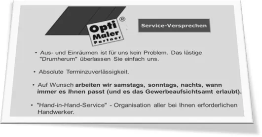 Und dann das: Auf Wunsch arbeiten wir samstags, sonntags, nachts und wann immer es Ihnen passt und es das Gewerbeamt zulässt. Es geht nicht mehr darum, die Wand weiß zu streichen. Es geht um die Serviceleistungen.
