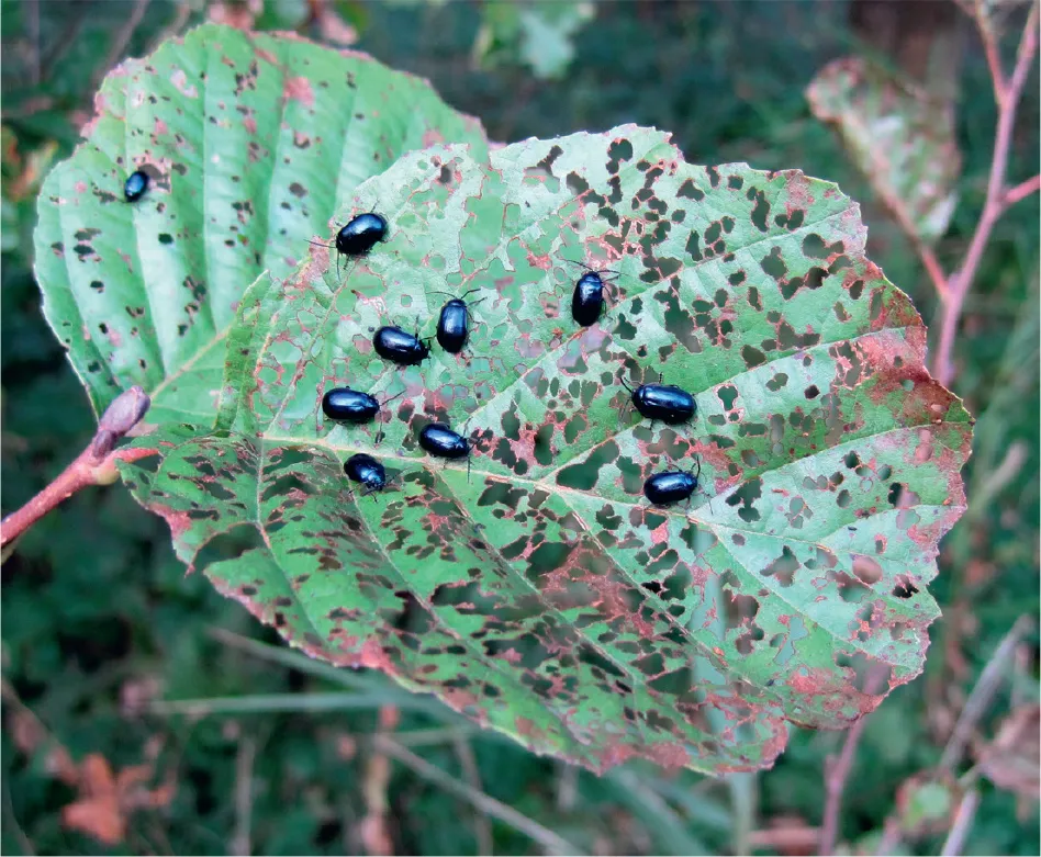 FIG 5. Alder Leaf Beetles Agelastica alni feeding on Alder Alnus glutinosa leaves at Askham Bog on the outskirts of York in 2019. This beetle was thought to have become extinct in Britain in the 1940s, but it reappeared in 2004, and is now becoming common at some locations in northern England.