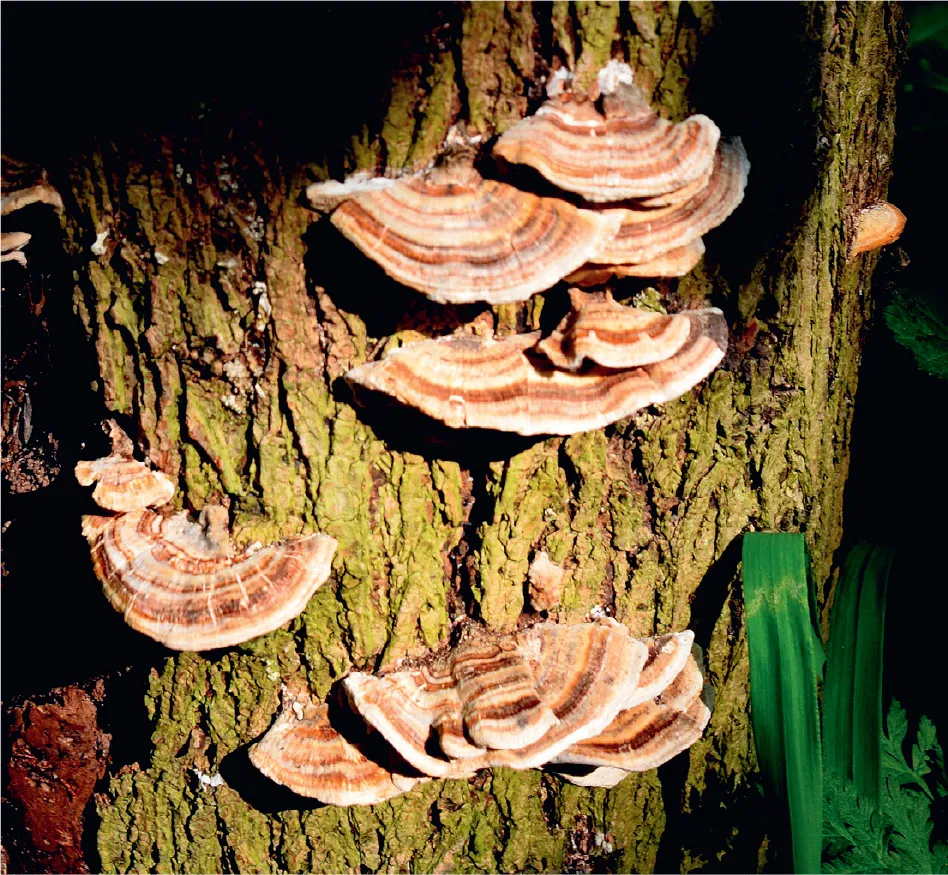 FIG 6. Turkeytail Trametes versicolor in Bunny Old Wood, Nottinghamshire. A very common fungus growing, and feeding, on dead wood. This is a very variably coloured species, and one of the commonest polypores in Europe (Kibby 2017).