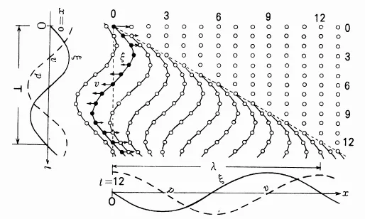 Therefore, the expression does not change. This means the phenomenon shifts through a distance c in 1 s, therefore, c is the sound speed. If we consider a certain position, for instance, where x = 0 in Equation (1.3), then ξ = A cos ωt, which means that it is a sine wave motion. Also at a certain time, for example when t = 0, ξ = A cos (−kx), which shows that the positions of moving particles also follow a sinusoidal pattern. In this case kx = 2π(x/λ), therefore, when (x/λ) is an integer the values of ξ are the same, and it is found that particles separated by λ are in the same phase. Also, k = ω/c...