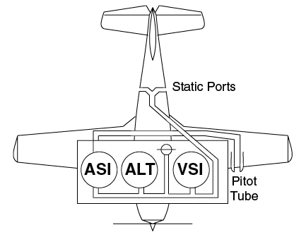The pitot-static system consists of a pitot (pressure-sensing) tube, a static (zero pressure) source, and related plumbing and filters. The pitot-static instruments are the airspeed indicator, the altimeter, and the vertical speed indicator; they measure changes in air pressure caused by the airplaneās vertical and horizontal movements in the atmosphere (see Figure 1-1).