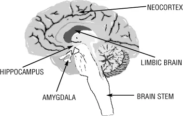 Located in a central part of the brain, called by some the limbic brain,8 are two structures that are crucial to learning and memory. These are the hippocampus and the amygdala (see figure 1). The hippocampus sorts and files the factual information that the brain learns. The amygdala sorts and files emotional information. To understand the importance of these two brain structures, we need to look briefly at how the brain processes information.