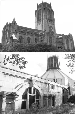 FIG 1.3: Despite the constraints upon the public purse after the First World War, there were still building projects on an imperial scale like the Anglican (top) and Roman Catholic (bottom) cathedrals in Liverpool. The former was completed in this period but work on the latter, designed by Sir Edwin Lutyens to be the largest in Christendom, was cut short by the Second World War. The familiar concrete ‘wigwam’ was erected later upon the foundations of the earlier building, the crypt of which can be seen in the foreground of the bottom picture.