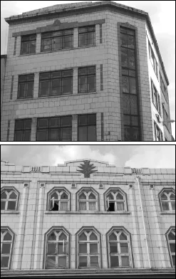 FIG 1.5: New shops in the latest Art Deco style were built along high streets in most towns and cities, especially department stores where a room or entire house could be fitted out by the one shop. These two examples, the lower one showing flats, commonly built above small shops, are finished in glazed white tiles with green highlights, a popular combination of colours. The tall vertical window in the top example has a wonderful stained-glass design.