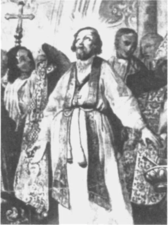 After the angels came St. Peter with a crozier in his hand, followed by St. Matthew, St. Mark, St. Luke and St. John, who preceded three great Doctors of the Church, St. Gregory, St. Augustine and St. Ambrose. Then came, vested as deacon and subdeacon, the Martyr Saints Lawrence and Stephen. And finally, as High Priest, arrayed in pontifical vestments and wearing a violet chasuble, there appeared in all the splendor of His Divinity, Our Lord and Saviour Jesus Christ. Then, as a breathtaking climax, just before God the Son began the Mass that was to consecrate this holy shrine forever to His Immaculate Mother, Mary herself took h...