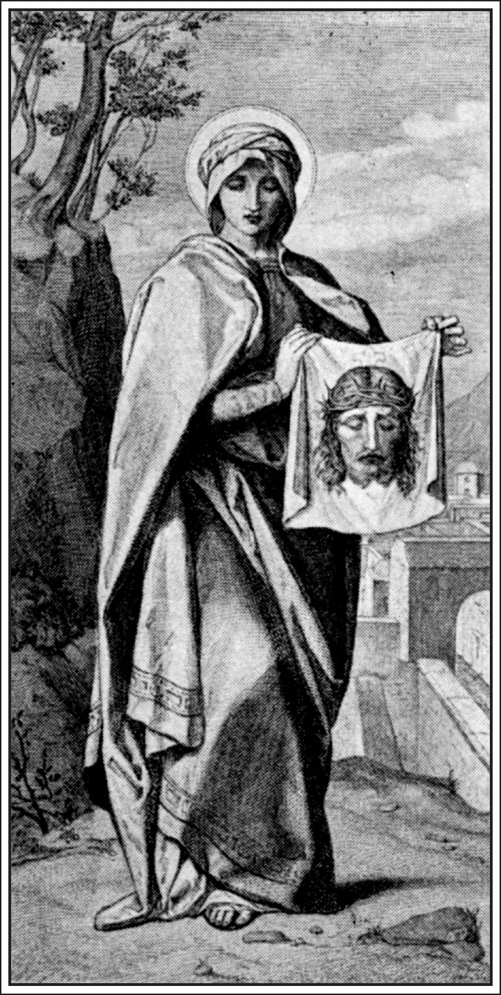 The Son of God was being led forth to execution through the crowded streets of Jerusalem, followed by a shouting rabble which filled the air with loud, insulting cries. Our Divine Lord, exhausted by the tortures of the night, fell beneath the heavy weight of His cross. A man, Simon of Cyrene, who was passing by, was compelled by the inhuman soldiers to assist Jesus in carrying the Cross. The sad procession had advanced but a short distance farther when suddenly a woman of majestic appearance broke through the infuriated mob and offered our Saviour a veil as a sign of her compassion, upon which He wiped His Adorable Face covered with sweat and blood. In reward for her sympathy, our Blessed Redeemer imprinted indelibly upon her veil the likeness of His Sacred Count...