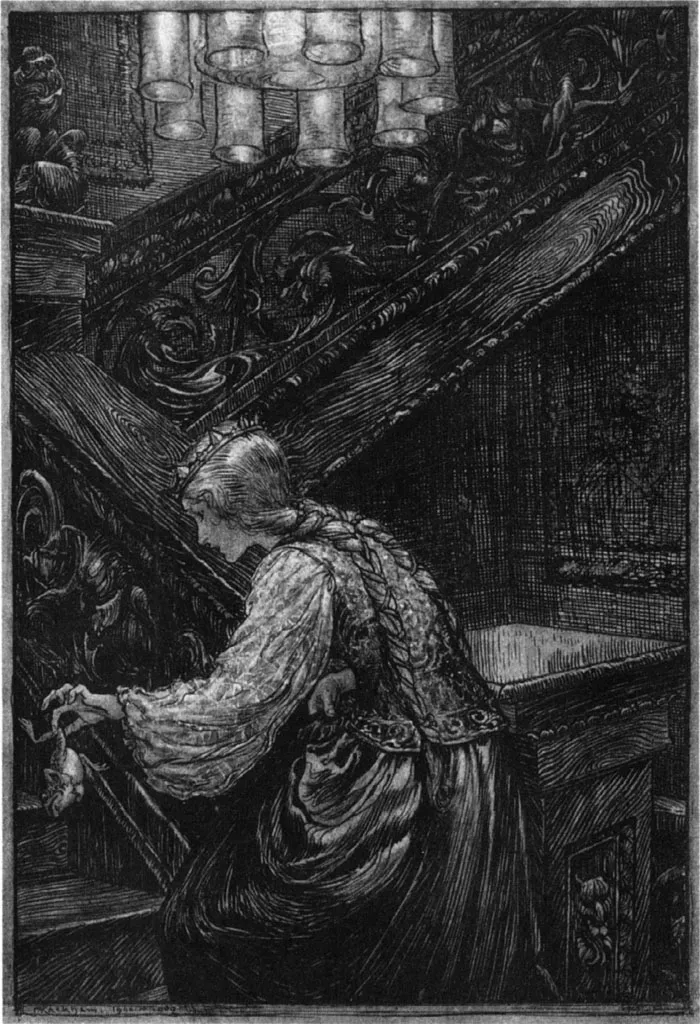 chair. There he sat still and cried, “Lift me up beside thee.” She delayed, until at last the King commanded her to do it. When the frog was once on the chair he
