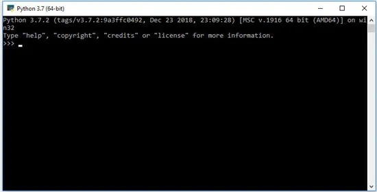 Python 3.7.0 (default, Aug 28 2018, 11:14:26)[GCC 7.3.0] on linuxType âhelpâ, âcopyrightâ, âcreditsâ or âlicenseâ for more information.>>>Similarly, on Windows, you get the prompt shown in the following screenshot: