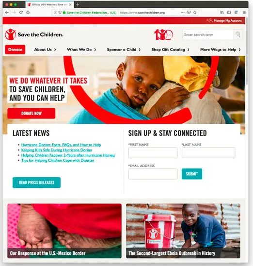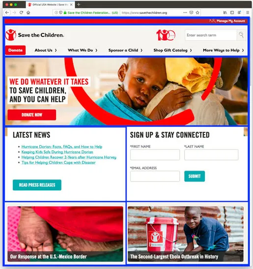 This is the home page of the Save the Children organizationās website (https://www.savethechildren.org/). Intuitively, you can identify several items on this page, each having a specific role. The user can easily identify such items to interact with the functionalities provided by the website.