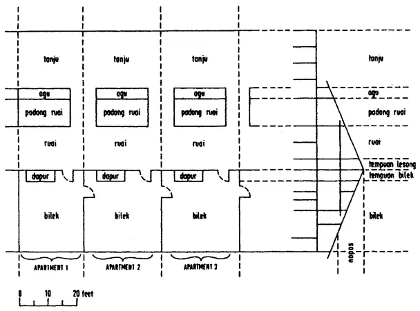 A long-house, then, is made up of a series of independently owned family apartments which are joined longitudinally one to the other so as to produce a single attenuated structure. Long-houses do, however, vary very considerably in size: from houses of three or four family apartments and scarcely over a chain in length, to houses that sprawl for more than three hundred yards along the bank of a river and contain upwards of forty different family sections. But before discussing in detail the overall composition of the long-house, let us first turn to a brief examination of the distinct sections or apartments from which every long-house is constructed. Each of these apartments is owned and occupied by a particular family group, and these family groups are the basic corporate units of Iban society. The principal divisions of a family apartment are: