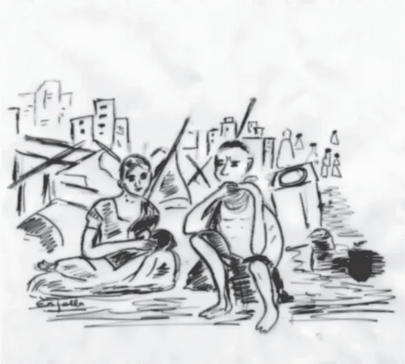 Many have come from far to settle in the City of Hope, convinced they would find jobs […] So they survive here, on the road, day after day, despite the pollution, heat, malnutrition, dirt, trucks and cars whizzing by, accidents, diseases, huge rats and crows, stinking gutters, the disgust of better-off passers-by and the monsoon floods […]