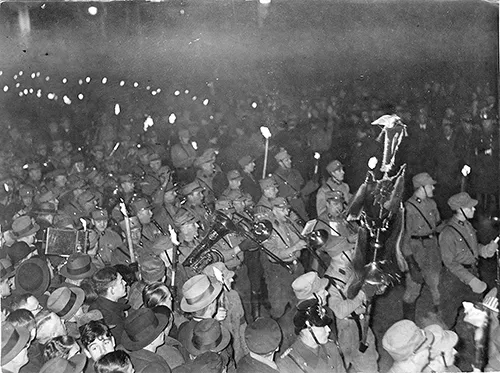 The SA menâdrunk on more than just victoryâhad to weave their way through the onlookers, while the billowing torches obscured visibility. January 30, 1933, must have been a typical Berlin winter day. Gloomy and cold. Anything but ideal conditions for the press photographers. Accordingly, the few pictures that were taken are hardly impressive. For this reason, the SA reenacted the torch march the following summer in order to create better images of an event that, at this point, had already been elevated to the status of national revolutionâand celebrated as a public holiday.1