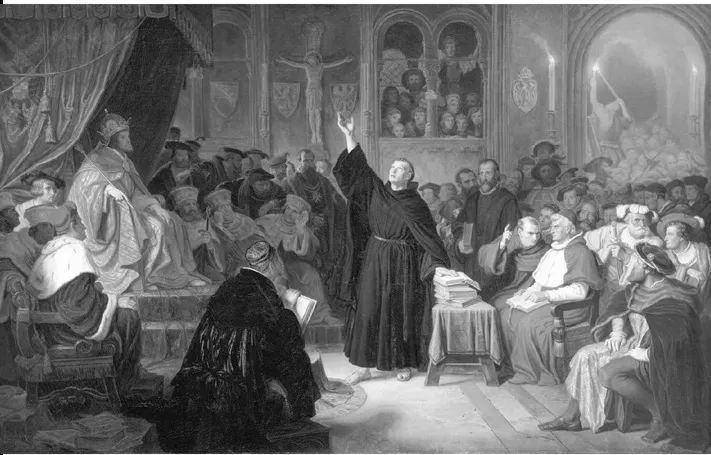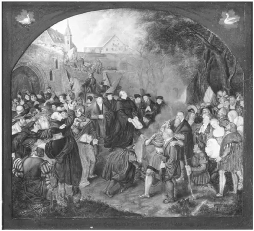 Von Luthers Gewittererlebnis bei Stotternheim, das ihn 1505 ins Kloster trieb, ĂŒber das »Turmerlebnis«, bei dem er seine reformatorische Entdeckung vom gnĂ€digen Gott machte, bis zum Thesenanschlag 1517, dann weiter von der Verbrennung der Bannandrohungsbulle 1520 als endgĂŒltigem Bruch mit dem Papst ĂŒber Luthers Auftritt beim Reichstag in Worms 1521 als Akt des Widerstands aus GewissensgrĂŒnden und dem Aufenthalt auf der Wartburg mit der Ăbersetzung des Neuen Testaments bis zu Luthers Hochzeit 1525 â Luthers Leben, jedenfalls in den stĂŒrmischen Anfangsjahren der reformatorischen Bewegung, lĂ€sst sich anhand solcher Szenen erzĂ€hlen, die die entscheidenden Lebensereignisse des werdenden Reformators bildhaft verdichten, narrativ eingĂ€ngig machen und fĂŒr aktualisierende Deutungen öffnen: Protestantische Ernsthaftigkeit kann man anhand des Stotternheim-Ereignisses veranschaulichen, welches einen jungen Mann zeigt, der sich bis in die letzte Konsequenz an sein in einer Notlage gegebenes Versprechen hĂ€lt; protestantische Innerlichkeit wird an der einsamen LektĂŒre und der daraus gewonnenen »reformatorischen Erkenntnis« im »Turmerlebnis« deutlich; der Thesenanschlag wird â allerdings erst im 19. Jahrhundert â zu dem Bild fĂŒr Luthers Reformstreben und Aufbegehren gegen die römische Kirche; vor dem 19. Jahrhundert wird die Konfrontation mit Rom in einer anderen Szene verdichtet, nĂ€mlich der Verbrennung der pĂ€pstlichen Bulle; Luthers Auftritt in Worms setzt die protestantische »Gewissensreligion«20 ins Bild; der Wartburgaufenthalt zeigt Luther als genialen Sprachschöpfer; und Luthers Hochzeit schlieĂlich symbolisiert das neue VerhĂ€ltnis, welches die Reformation dem Einzelnen gegenĂŒber der Welt ermöglicht, zeigt Luther als Stifter des evangelischen Pfarrhauses und als Familienvater.