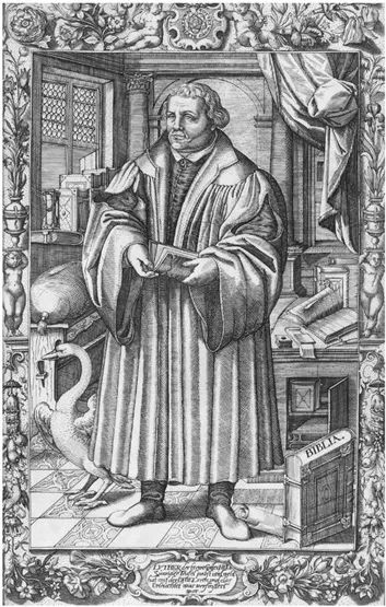 Abb. 3: Luther mit dem Schwan: Kupferstich, um 1620, aus: Biblia ⊠Goslar: Johann Vogt, 1620.
