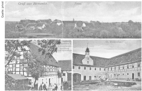 Ansichtskarte vom Dorf Birmenitz. Das Wallrabe-Gut nimmt darauf einen prominenten Platz ein.