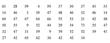 Researchers studied the emotional health of 58 12- to 19-year-old foster care adolescent males who reside in a group home in Virginia. Emotional health was measured by having the adolescents respond to statements such as "Sometimes I feel so ashamed of myself that I just want to hide in a corner and cry" and "I often blame myself even when I am not at fault." Responses were scored so that higher scores indicate better emotional health. The average score for the national standardization group was 50. These scores were obtained for the 58 foster care males:1