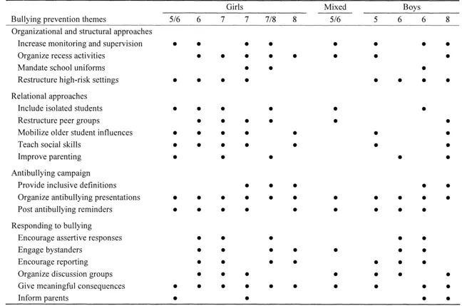 Audio recordings were transcribed and identifiers were removed. The lead investigator, a research assistant, and a school social worker reviewed transcripts and developed preliminary thematic categories (Patton, 2002). Investigators noted suppositions and biases (e.g., two investigators developed and evaluated peer mediation programs) and attempted to limit their influence (Patton, 2002). To reduce potential gender biases, for example, male and female investigators participated at all stages of the data analysis. A researcher without links to the schools used NVivo-7 to code the transcripts. Next, two investigators with expertise in school-based prevention independently reviewed the transcripts. Table 1 summarizes the grade and sex of the participants in the study's 11 focus groups and the distribution of bullying prevention themes across groups. Initial interobserver agreement on the occurrence of themes in a random sample of three groups was 81%. Discrepancies were resolved via consensus, definitions were revised, and new codes were introduced. Quotations representing recurring themes were selected, and transcripts were searched for supporting and disconfirming examples (Patton, 2002).