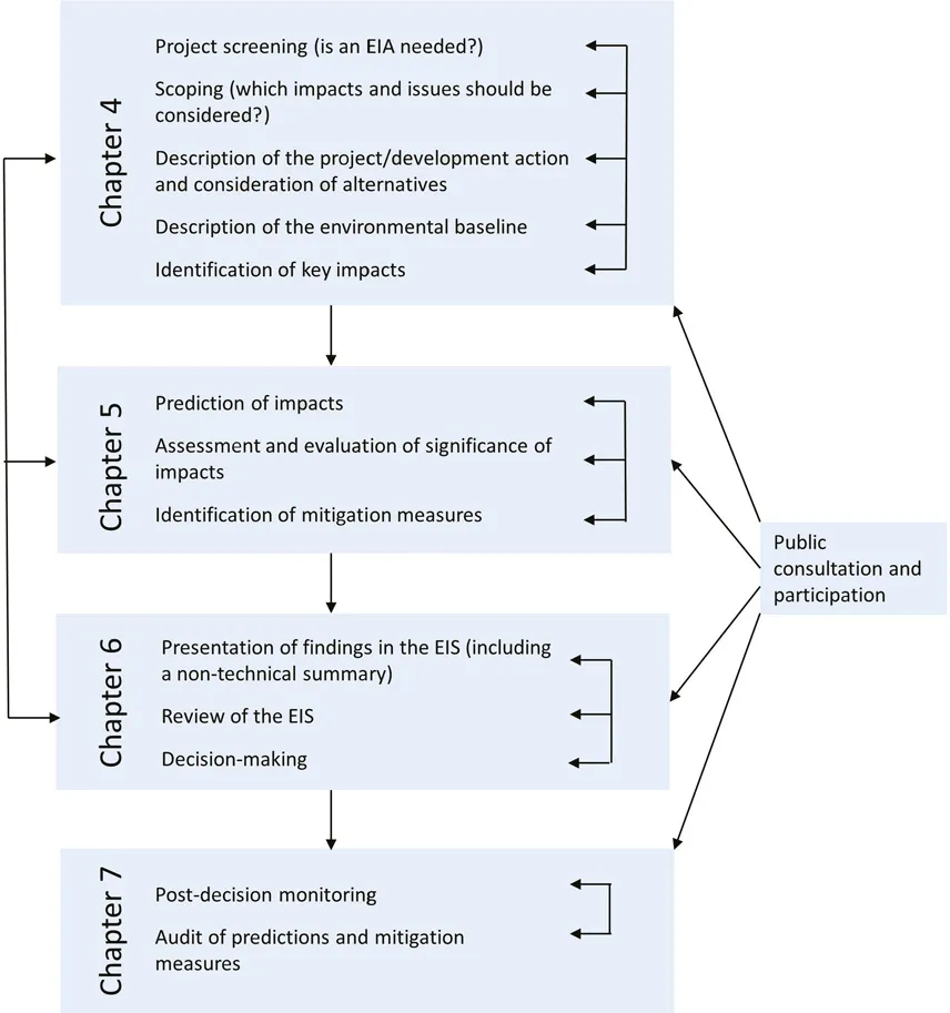 - an appraisal of some next steps in the EIA process, including a more effective and proportionate EIA; the impact of technological change; the changing interpretation of the project; project implementation, monitoring and adaptive management; and moves towards a more integrated impact assessment. Together, these topics act as a kind of action list for future EIA;