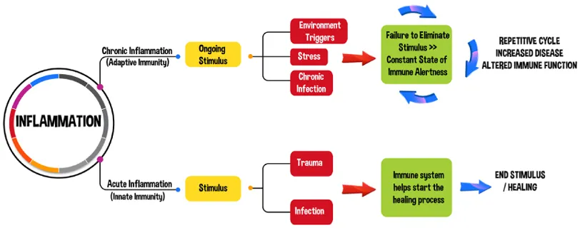 There are two types of inflammation. Acute inflammation is good inflammation that lasts for a short time. This is what the body is supposed to do; it fixes what needs to be fixed. It can heal us from injuries or get rid of what is detrimental to the body. The body requires just the right amount of inflammation; too little or too much inflammation can lead to problems. If the immune system is triggered for a long time (because of constant exposures to triggers like toxic impure food, toxins in the environment, chronic stress, allergens or low grade infections), it can cause too much inflammation leading to a heightened response, or chronic inflammation.
