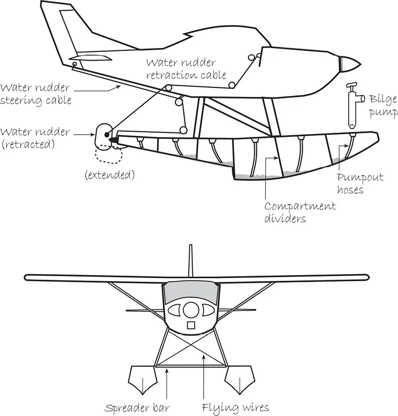 The floats are connected to the fuselage by struts, and connected to each other by spreader bars. This arrangement provides for strength, but is not inherently rigid. To maintain the alignment of the floats, the seaplane depends on two sets of flying wires that go between the struts. These should be looked at during the preflight to make sure they are tight. The front set of wires can be seen in Figure 1. All the attach points of the float struts and flying wires should be inspected for cracks and secure bolts.