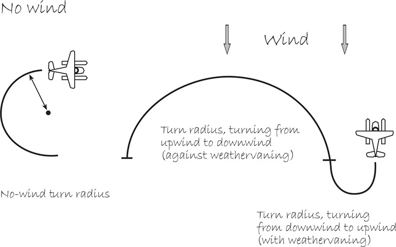 When you first taxi a seaplane, get a feel for how tight it can turn in order to let you know how tight an area you can maneuver in. Observe the turn radius in a no-wind situation and note that the wind affects this in the following way: when turning from an upwind heading to a downwind heading, the weathervaning opposes this turn, and significantly increases its radius. Weathervaning encourages a turn from downwind to upwind, and this turn can be done in a much smaller radius. When beginning a turn, keep the windâs influence in mind. This is shown in Figure 2.