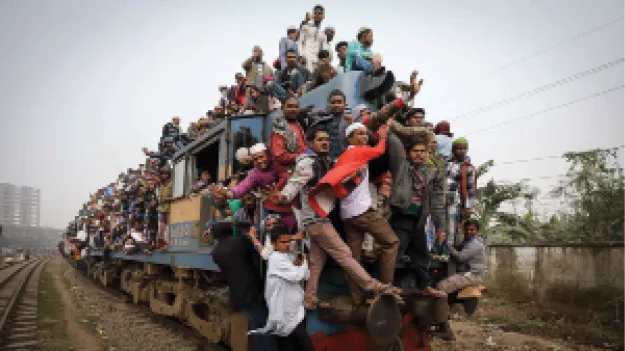Overcrowded passengers on a train in overcrowded Dhaka, Bangladesh.