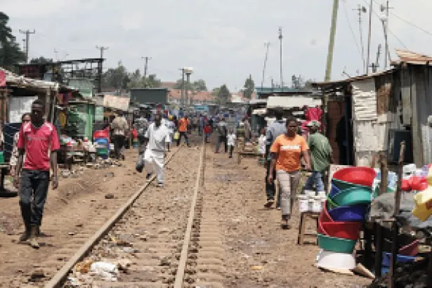Living dangerously. People in Kibera, Nairobi, Kenya, with houses near the railway line.