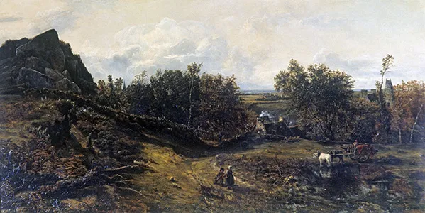 At the 1833 Salon, Rousseau submitted a view of the environs of Granville (see Figure 1.2), a coastal town in the far west of Normandy, that he had visited in 1831. He was the first to represent this town at the Salon, signaling his early interest in remote and unconventional subjects. His choice of motif was radical in its very mundanity. Rousseau paid careful attention to the rendering of tree trunks, moss on rocks, and ferns and tree foliage and largely hid a group of picturesque cottages while offering only a distant glimpse of tiny ships on the ocean. He gave prominence to his rural staffage of cart and horses, and two young children, accompanied by a goat. In an early letter, Rousseau praised peasant culture that offered a solution for “all the problems proposed by Fourrier [sic].”23 The prominent utopian thinker Charles Fourier had railed against the limitations of bourgeois materialism and sought to establish independent communities, known as “phalansteries,” that would allow the full realization of human passions. For Rousseau, the poetry and practical good sense of peasant life offered a preferable alternative to the somewhat contrived existence of the “phalanstery.” He described rural villagers as “poets in sabots,” noting that “their imaginative language is much more evocative than that of city dwellers.”24 Rousseau’s staffage in his Granville view was undoubtedly also a nod to The Haywain (National Gallery, London) by the English painter John Constable, which offered a radical model for naturalistic landscape because of its similar everyday subject and lively impasto.25 Rousseau knew Constable’s work through his friendship with the Anglo-French dealer John Arrowsmith, and probably saw The Haywain when it appeared at the Boursault collection sale in Paris in May 1832.26 For the influential critic Étienne-Jean Delécluze, Rousseau’s studied naturalism distinguished him as the leading landscape painter of the new generation.27