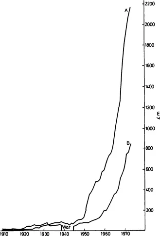 We may mention first the actual amounts spent on the road system in the past by central and local government (see Fig. 1.1). On reflection these amounts seem less than desirable in most years, yet they were intended to be the right amounts to ‘solve’ the road problem in the sense that more would have been too much, less too little in the opinion at the time of the central and local authorities responsible for determining them. The fact was of course that they were governed by (a) short-term considerations and (b) unfortunate theories of public finance.
