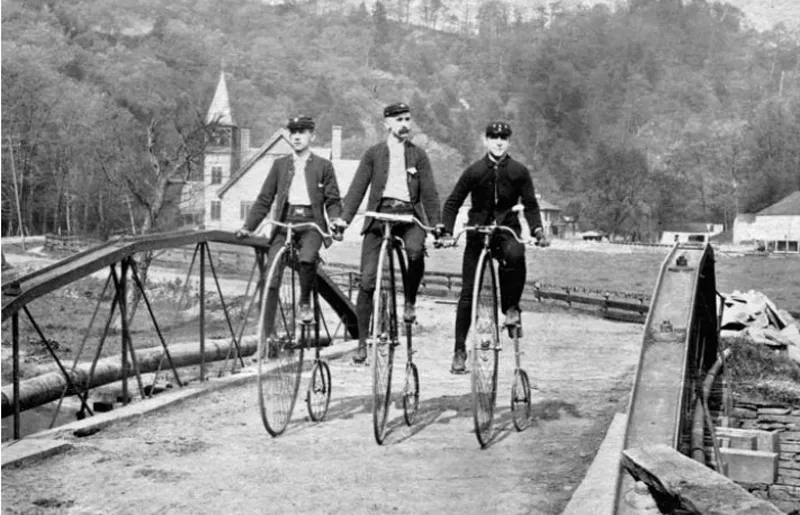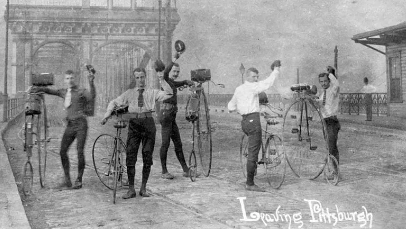 Lenz (far left) and Petticord (middle) on Pittsburgh’s Smithfield Street Bridge, August 9, 1891, departing for New Orleans. Between them is Ned Friesell, who considered going with Lenz on his world tour.