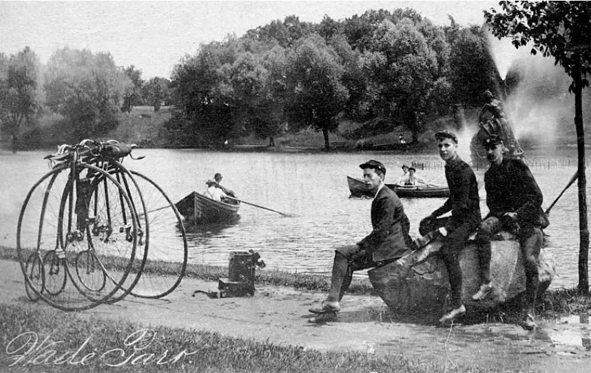 The same trio (Lenz in center) poses in Cleveland’s Wade Park, July 4, 1890, the same day Allen and Sachtleben arrived in Liverpool to start their world tour.