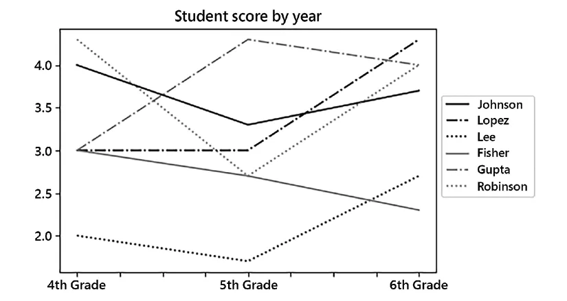 students = pd.read_csv('data/students-scores.csv') students Last Name First Name 4th Grade 5th Grade 6th Grade 0 Johnson Mia A B+ A- 1 Lopez Liam B B A+ 2 Lee Isabella C C- B- 3 Fisher Mason B B- C+ 4 Gupta Olivia B A+ A 5 Robinson Sophia A+ B- A # Generic conversion of letter grades to numbers def num_score(x): to_num = {'A+': 4.3, 'A': 4, 'A-': 3.7, 'B+': 3.3, 'B': 3, 'B-': 2.7, 'C+': 2.3, 'C': 2, 'C-': 1.7} return x.map(lambda x: to_num.get(x, x)) (students .set_index('Last Name') .drop('First Name', axis=1) .apply(num_score) .T .plot(title="Student score by year") .legend(bbox_to_anchor=(1, .75)) );